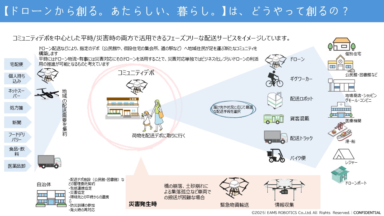 さらに、平時には配送に使用するドローンを、有事の際には命を支える救援活動に活用するモデルを構築し、地域社会の安全と安心を支えます。